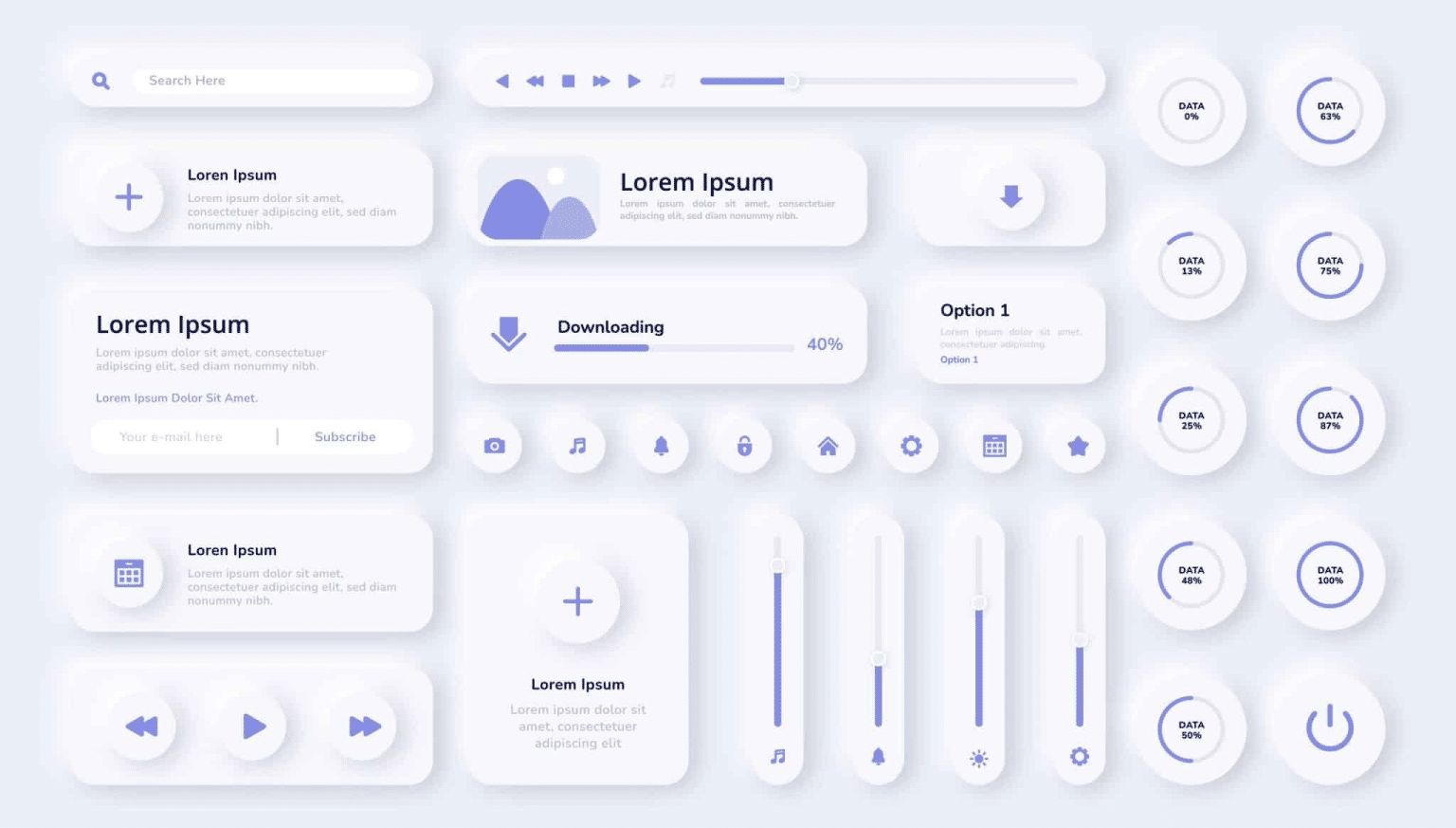 Cette tendance séduit par sa capacité à rendre les interfaces modernes et attrayantes. Les arrière-plans dégradés et les tons neutres créent une ambiance calme et professionnelle. Les ombres douces ajoutent de la profondeur et mettent en valeur les icônes. Bien que minimaliste, ce design donne une sensation de vie et de dynamisme aux éléments graphiques.