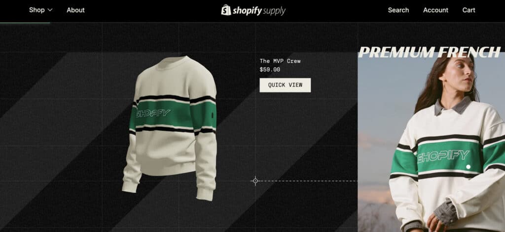 Exemple d’intégration 3D en web design : cette page e-commerce utilise un modèle 3D du produit que l’on peut manipuler, rendant l’expérience plus vivante et interactive.Voir l’exemple de site créér à l’aide de Shopify